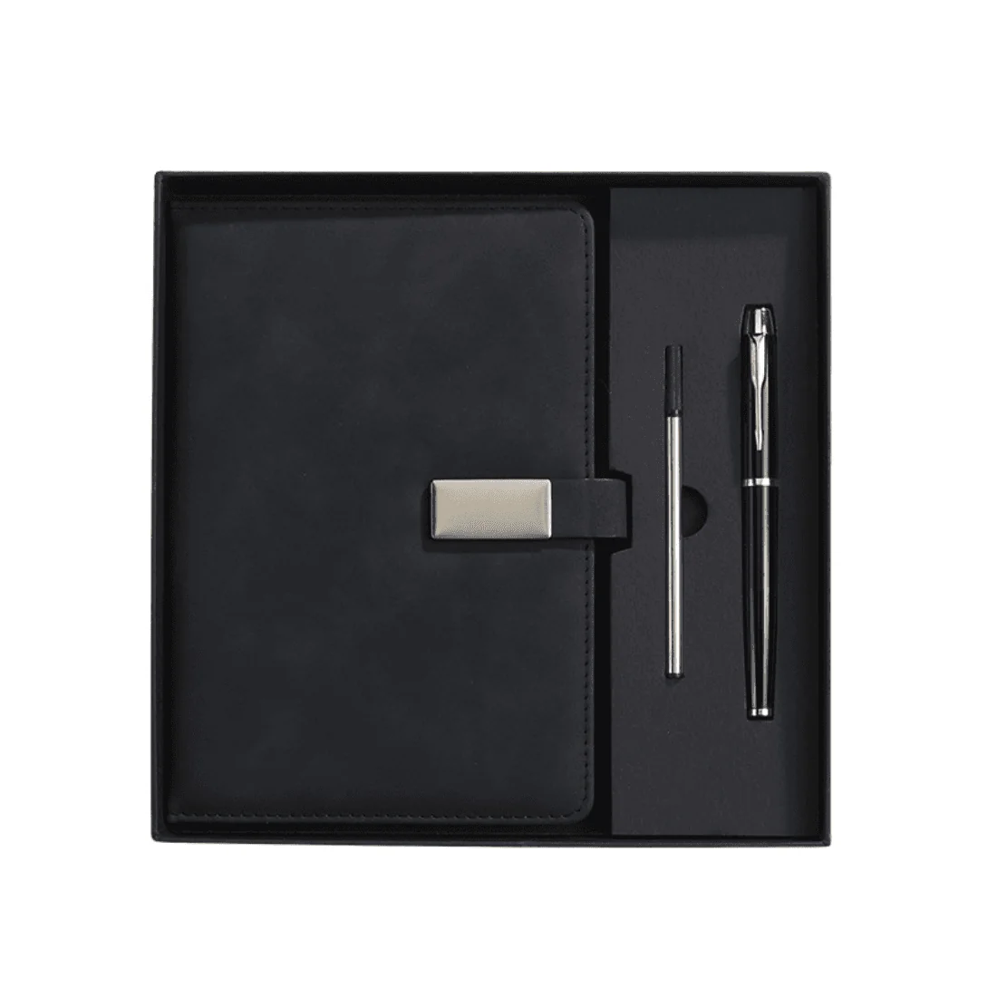 Бизнес-блокнот A5 с обложкой из экокожи, магнитной застежкой и бумагой 80 г/м². Подарочный набор в черном или сером цвете.